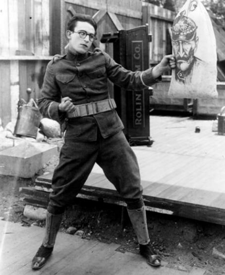 From Kicking the Germ Out of Germany (1918) … note the Rolin Film Company prop box behind HL, as well as the Kaiser’s image on the punching bag.